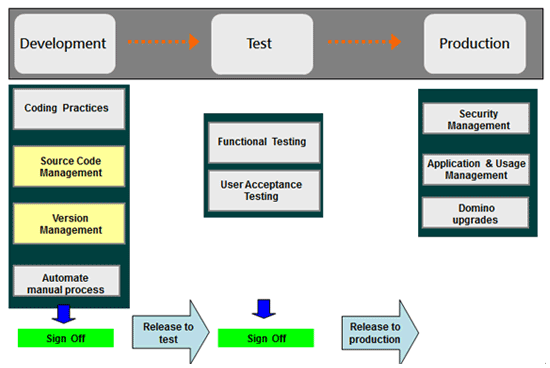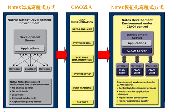 開發、測試與營運上線,自動化建置系統改善了上版流程過程中的一致性及控制力度,達到自動上傳與效率化。透過這樣的方式,就可以讓 “設計者、 Domino 管理者、使用者、系統管理者” 在 “開發、測試、正式營運” 三種環境中,做到權限安全分明、符合稽核審查、分工清楚、專人負責